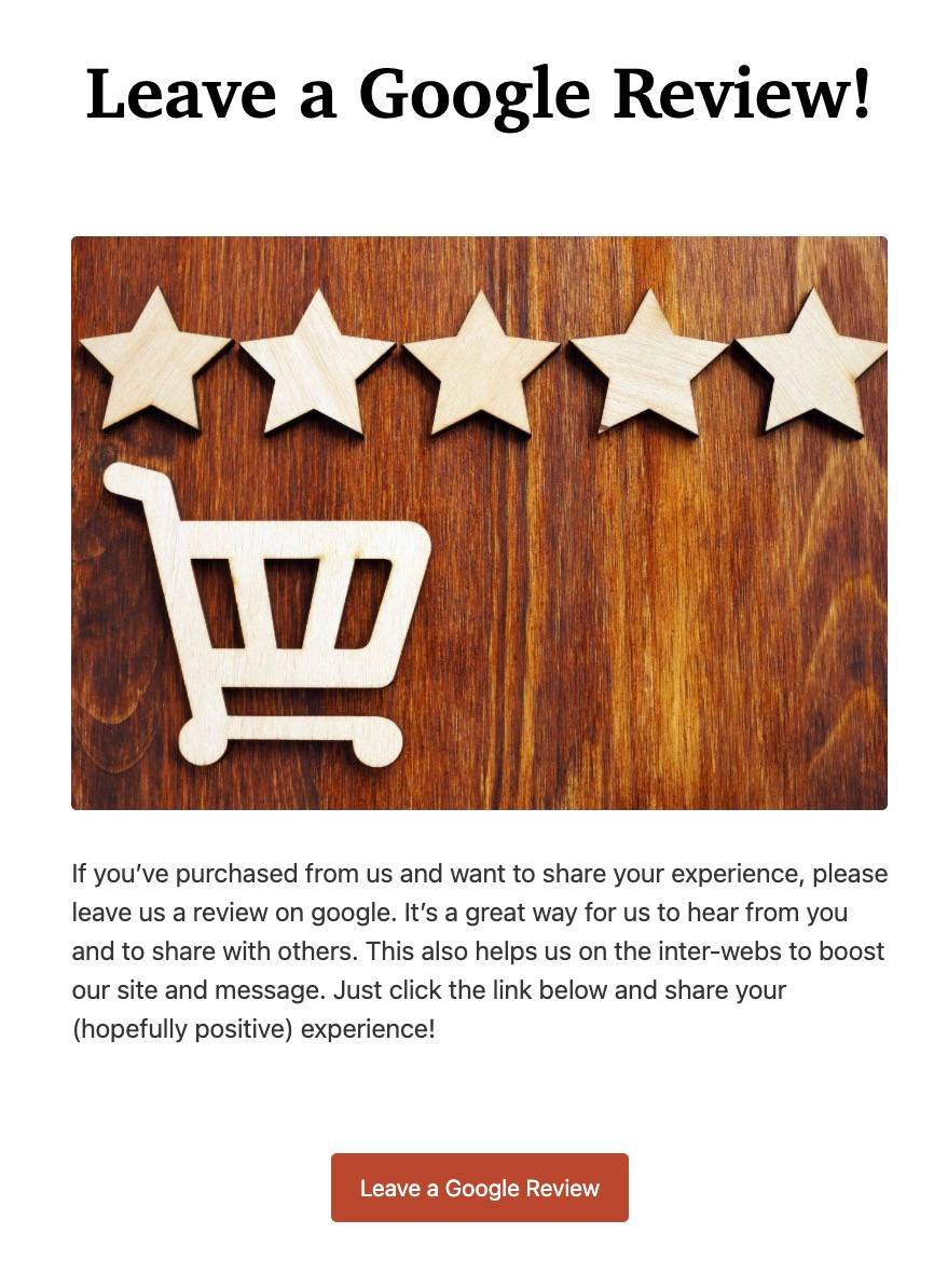 "Thanks so much for your order. If you have a minute, we'd love a Google review — it helps other families find us. Here's the link: [your Google review link]"